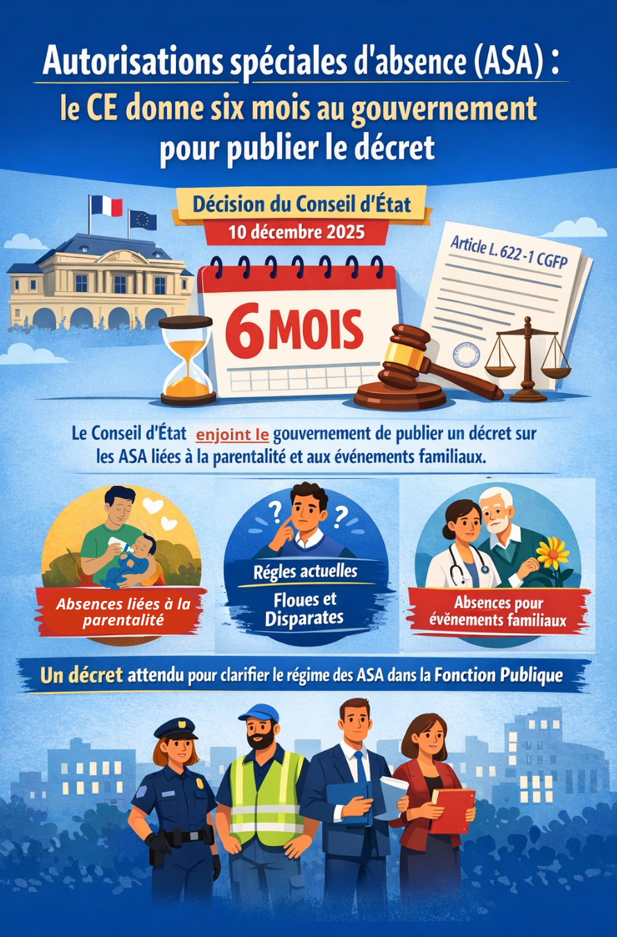 Dans une décision rendue le 10 décembre 2025, le Conseil d'État a enjoint le Premier Ministre à "prendre les mesures règlementaires" pour permettre l'application de l'article L. 622-1 du Code Général de la fonction publique (CGFP) qui fixe la liste des autorisations spéciales d'absences liées à la parentalité et à certains évènements familiaux.